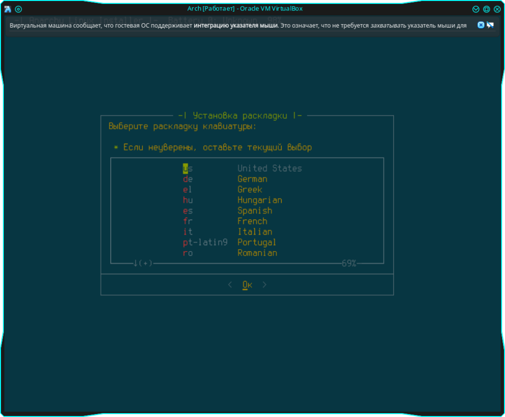 Раскладку клавиатуры оставляем по умолчанию, поскольку Arch хронически страдает проблемами с переключением языков при первом входе в систему.