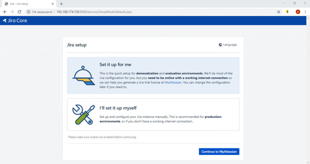 После установки откроем окно браузера и перейдем по ip адресу виртуальной машины : порт. По умолчанию, если вы не меняли порт Jira 8 использует порт 8080.