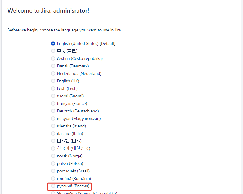 Шаг 7. Далее мы выбираем язык системы с которым будет работать Jira 8, язык можно изменить в настройках пользователя. В Jira так же доступен русский язык.