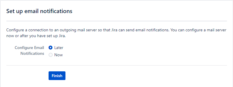 Шаг 6. На данном шаге Jira предложит нам настроить подключение к почтовому серверу для рассылки уведомлений мы выберем позже.