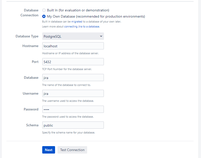 To run Jira in production you’ll need an external database. Check the Supported platforms page for the version you’re installing for the list of databases we currently support. If you don’t already have a database, PostgreSQL is free, easy to set up and has been extensively tested with Jira. Good to know: