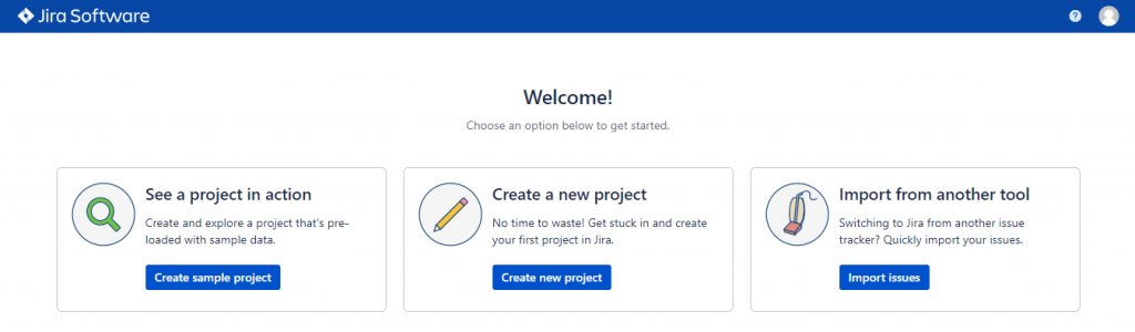 По окончании настройки Jira 8, предложит создать нам новый проект, на наш выбор будет предложено три вариант: демо проект, новый пустой проект и импортировать новой проект.