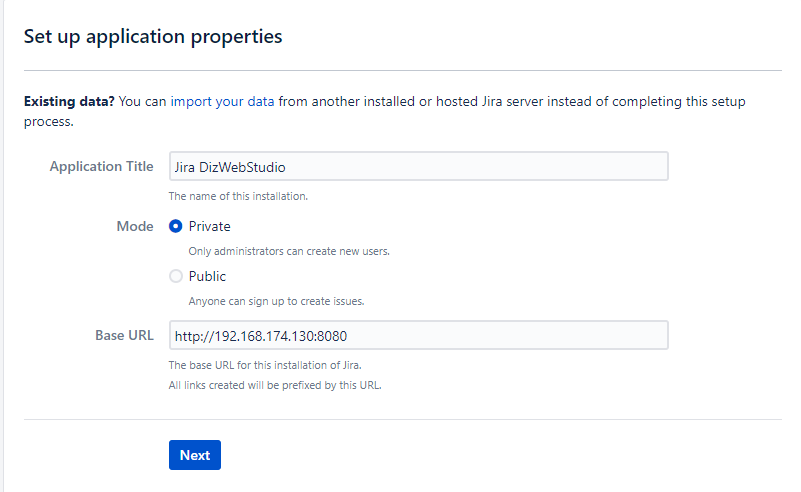 Шаг 3. Укажем название для нашей тестовой Jira, в качестве Mode режима выбираем приватный, что бы только администраторы системы могли создавать пользователей. Базовой Url изменять не будем.