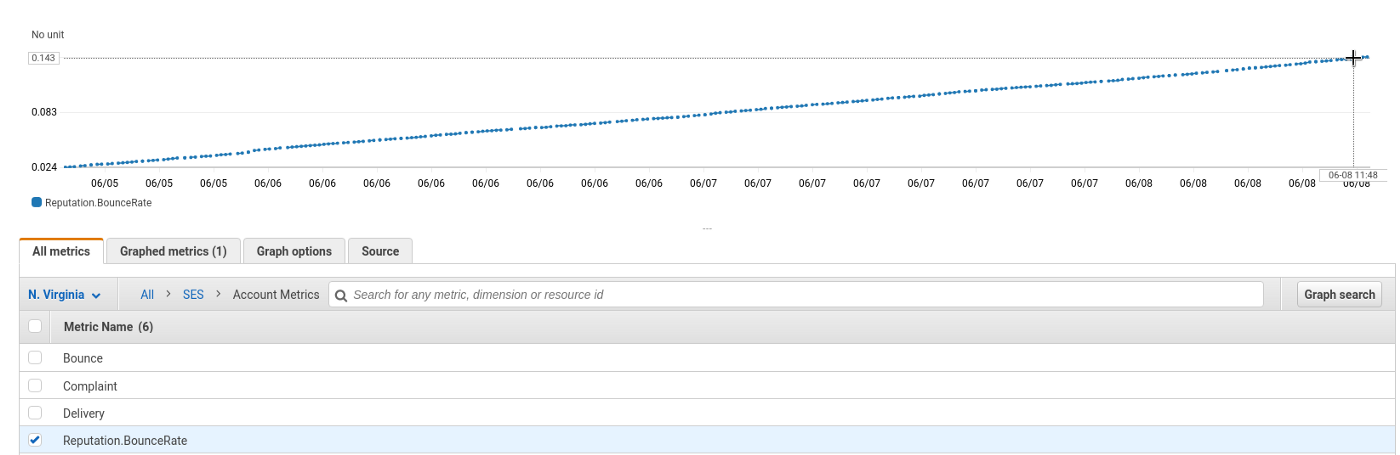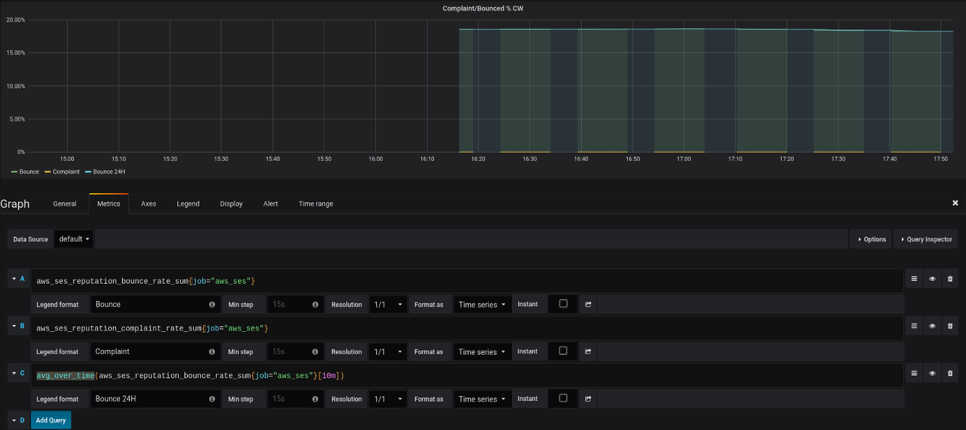 - alert: AWSSESReputationBounceRate  expr: aws_ses_reputation_bounce_rate_sum{job="aws_ses"} * 100 > 5  for: 1s  labels:    severity: warning  annotations:    summary: 'AWS SES Bounce rate too high'    description: 'Latest observed value: {{ $value | humanize }} %'    tags: aws