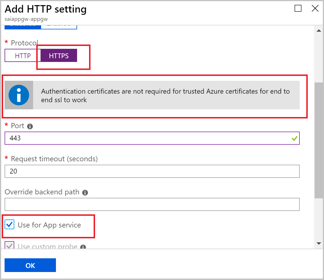 For example, if the backend certificates are issued by a well known CA and has a CN of contoso.com, and the backend http setting’s host field is also set to contoso.com, then no additional steps are required. You can set the backend http setting protocol to HTTPS and both the health probe and data path would be TLS enabled. If you’re using Azure App Service or other Azure web services as your backend, then these are implicitly trusted as well and no further steps are required for end to end TLS.
