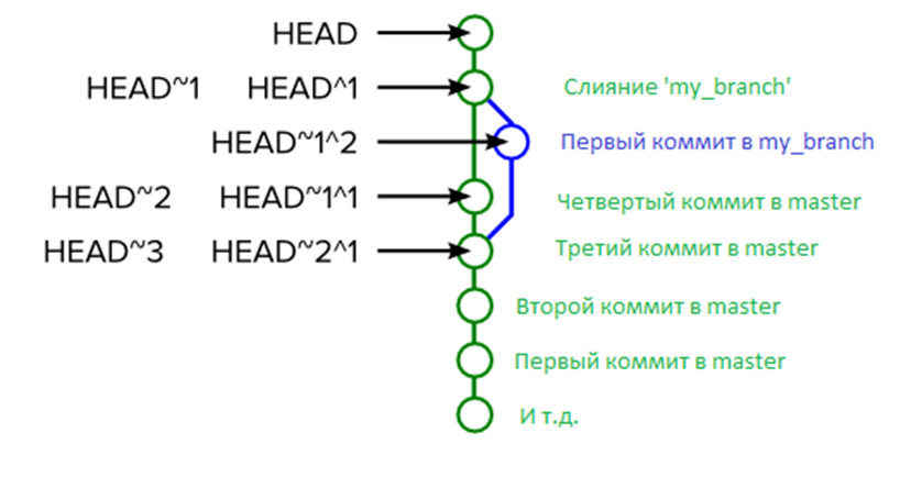 - HEAD^ (или HEAD^1) тоже означает первого родителя коммита. Но вот HEAD^2 означает второго родителя коммита. Помните, коммит, представляющий собой нормальное слияние (merge), имеет двух родителей: первый родитель — это коммит, в который осуществляется слияние, а второй родитель — коммит, который был слит. Вообще говоря, слияния могут иметь произвольно много родителей (octopus merges).
