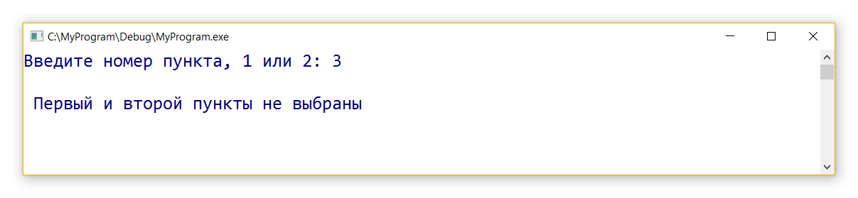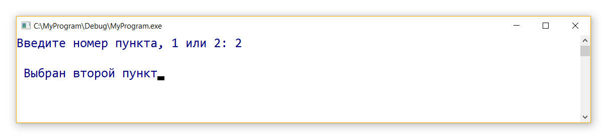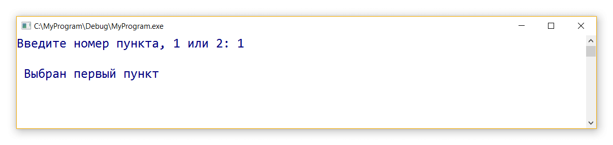 #define _CRT_SECURE_NO_WARNINGS // для возможности использования scanf#include <stdio.h>#include <stdlib.h> // для использования функции systemint main() { int key; // объявляем целую переменную key system(«chcp 1251»); // переходим в консоли на русский язык system(«cls»); // очищаем окно консоли printf(«Введите номер пункта, 1 или 2: «); scanf(«%d», &key); // вводим значение переменной key if (key != 1) { // если key не равен 1 if (key == 2) // если key равен 2 printf(«\n Выбран второй пункт»); // вывод сообщения } // если key — не 1 и не 2, то ничего не выводится else // иначе, если key равен 1 printf(«\n Выбран первый пункт»); // вывод сообщения getchar(); getchar(); return 0;}