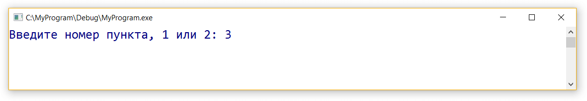 #define _CRT_SECURE_NO_WARNINGS // для возможности использования scanf#include <stdio.h>#include <stdlib.h> // для использования функции systemint main() { int key; // объявляем целую переменную key system(«chcp 1251»); // переходим в консоли на русский язык system(«cls»); // очищаем окно консоли printf(«Введите номер пункта, 1 или 2: «); scanf(«%d», &key); // вводим значение переменной key if (key == 1) // если key = 1 printf(«\n Выбран первый пункт»); // выводим сообщение else if (key == 2) // иначе если key = 2 printf(«\n Выбран второй пункт»); // выводим сообщение else // иначе printf(«\n Первый и второй пункты не выбраны»); // выводим сообщение getchar(); getchar(); return 0;}