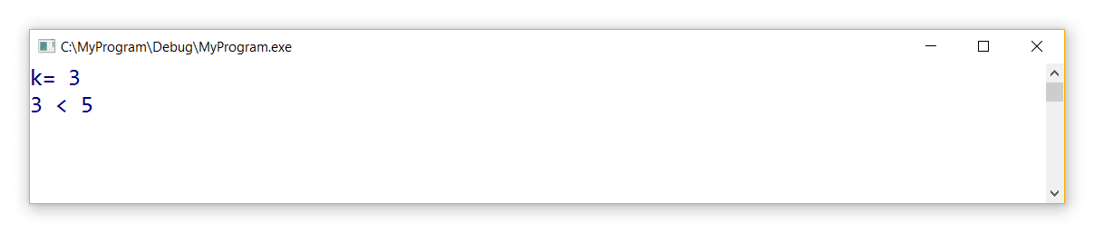#define _CRT_SECURE_NO_WARNINGS // для возможности использования scanf#include <stdio.h>int main(){ int k; // объявляем целую переменную k printf(«k= «); // выводим сообщение scanf(«%d», &k); // вводим переменную k if (k >= 5) // если k>5 printf(«%d >= 5», k); // выводим «ЗНАЧЕНИЕ >= 5» else // иначе printf(«%d < 5», k); // выводим «ЗНАЧЕНИЕ < 5» getchar(); getchar(); return 0;}