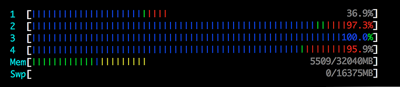 По умолчанию, показывает цветные строки состояния для процессоров, памяти и свопа. Слева направо полосы окрашиваются в зеленый, синий, желтый и красный цвет в зависимости от некоторых пороговых значений.