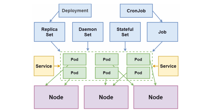 Группировка контейнеров разных типов требуется в том случае, когда они взаимозависимы и должны запускаться в одной ноде. Это позволяет увеличить скорость отклика во время взаимодействия. Например, это могут быть контейнеры, хранящие веб-приложение и сервис для его кэширования.