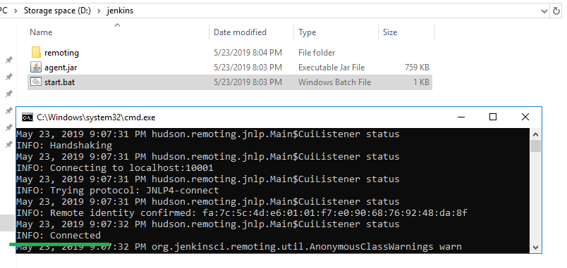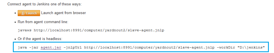 - Копируем командную строку и записываем ее в bat-ник, заодно скачиваем agent.jar по гиперссылке. Все это помещаем в каталог, который мы выделили ранее для slave дженкинса.