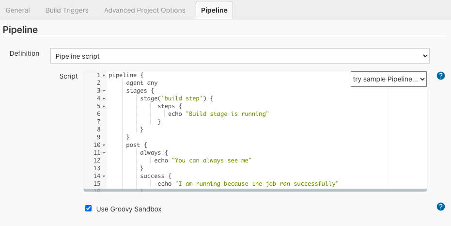 pipeline{ agentany stages{ stage(‘build step’){ steps{ echo»Build stage is running» } } } post{ always{ echo»You can always see me» } success{ echo»I am running because the job ran successfully» } unstable{ echo»Gear up ! The build is unstable. Try fix it» } failure{ echo»OMG ! The build failed» } } } |