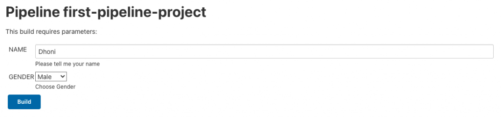 pipeline{ agentany parameters{ string(name’NAME’,description’Please tell me your name’) choice(name’GENDER’,choices’Male’,’Female’,description’Choose Gender’) } stages{ stage(‘Printing name’){ steps{ script{ def name=»${params.NAME}» def gender=»${params.GENDER}» if(gender==»Male»){ echo»Mr. $name» }else{ echo»Mrs. $name» } } } } } } |