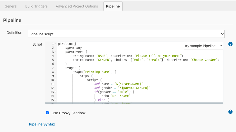 script block is wrapped inside the steps block. In the above example, we are printing the name passed as parameter suffixed with Mr. or Mrs. based on the Gender chosen.