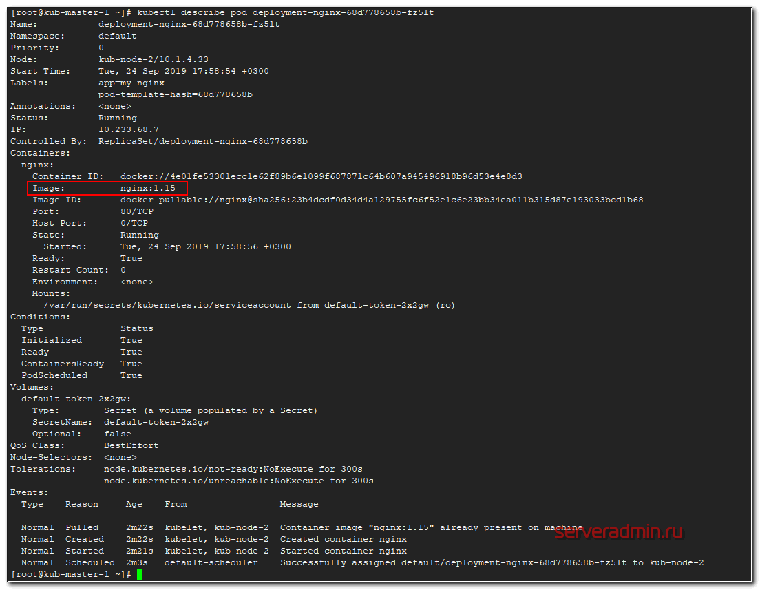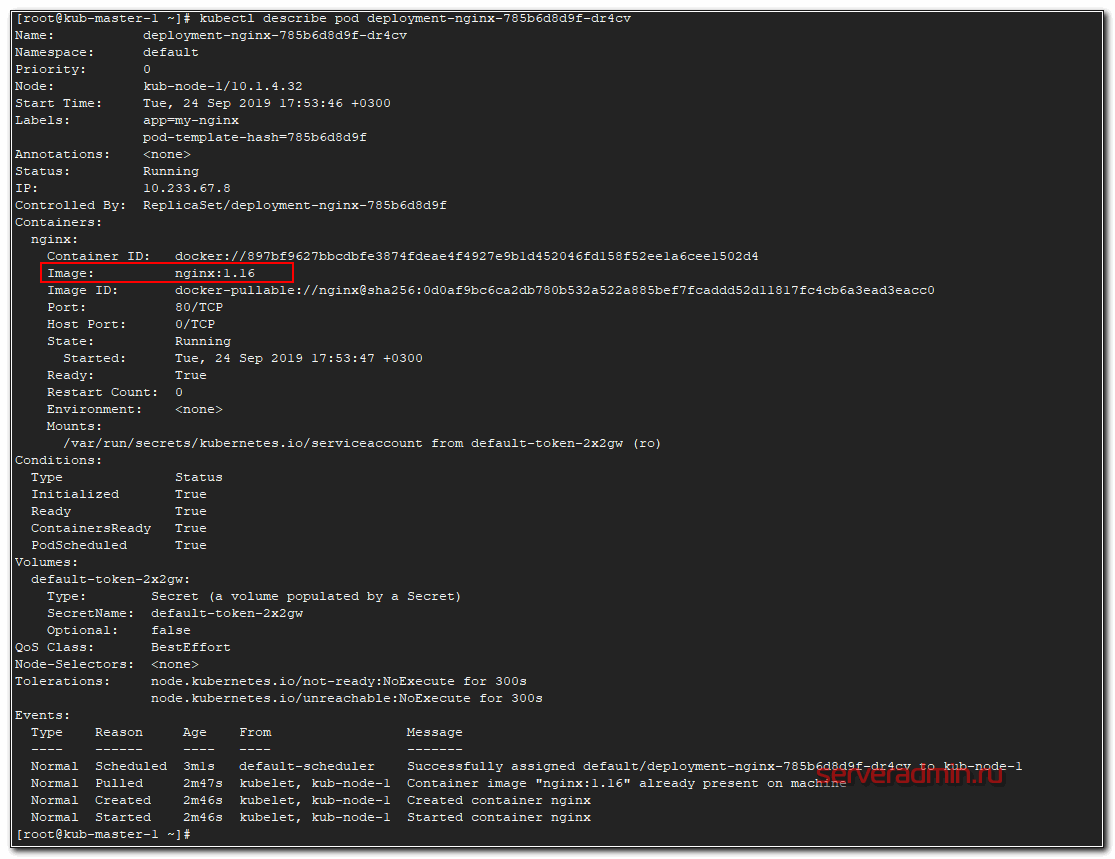 Версия nginx изменилась во всех подах. Стратегия обновления описана в шаблоне деплоймента в разделе strategy. В данном случае используется тип RollingUpdate, когда deployment постепенно уменьшает количество реплик старой версии и увеличивает реплики новой версии, пока они все не заменят старые. При этом replicaset с предыдущей версией контейнера осталась. Она не удаляется для того, чтобы можно было потом оперативно вернуться на предыдущую версию, если с новой будет что-то не так. Для этого достаточно будет по очереди погасить поды новой replicaset и запустить старые. Делается это следующим образом.