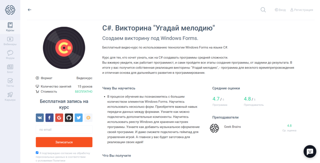 Программа обучения: изучение технологии Windows Forms для написания программ средней сложности на языке C#. Он рекомендован новичкам и программистам с небольшим опытом. Практическая часть программы включает самостоятельное написание викторины «Угадай мелодию».