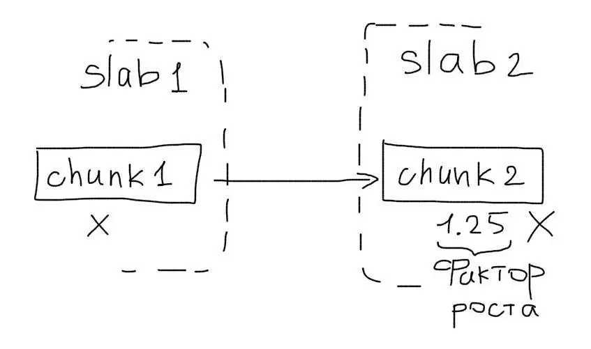 В Memcache настройка размеров чанков и их количества производится с помощью фактора роста. Это соотношение размера большего чанка к меньшему: