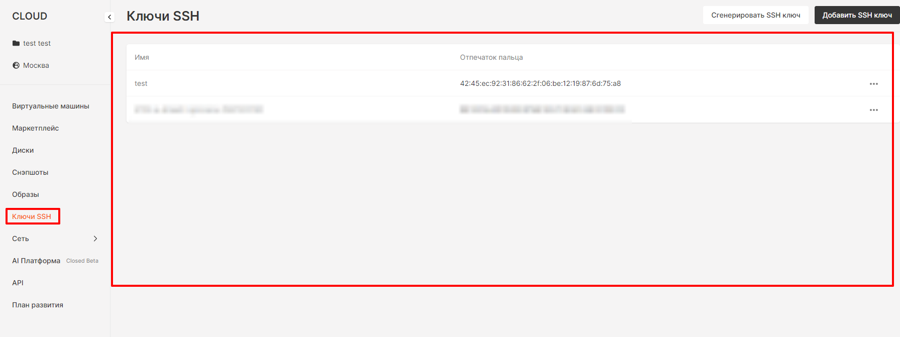 После добавления или генерации нового SSH ключа, ключи будут появится в разделе «Ключи SSH».