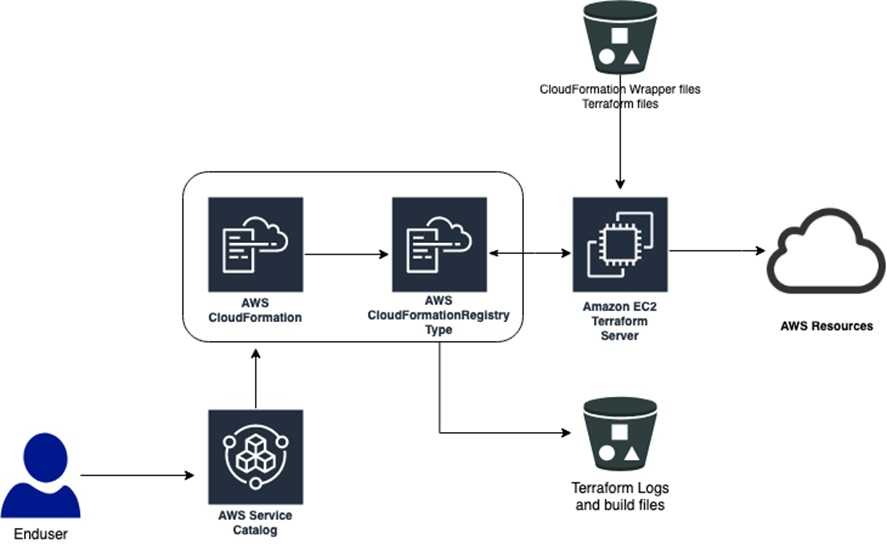 Either way, CloudFormation uses the resource to communicate with the Terraform server. After that, the Terraform server manages the AWS resources, and the resource provider logs the activity into an S3 bucket.