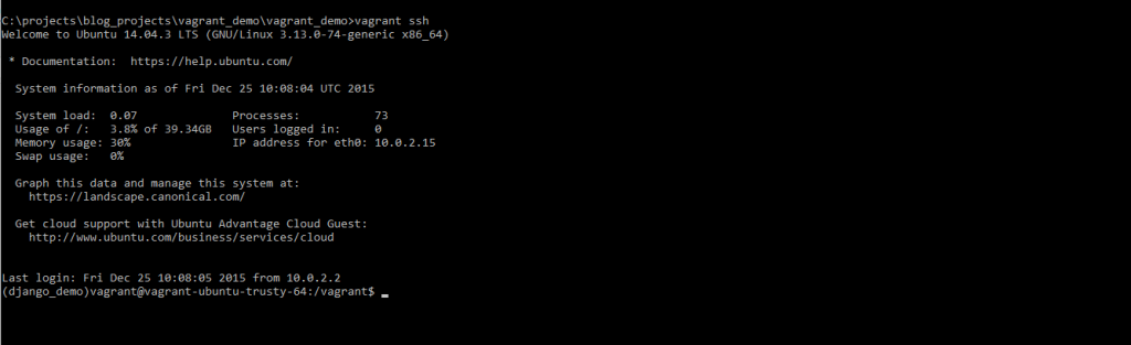 Демо пример с Vagrant, поднимающим отдельную виртуальную машину с виртуальным окружением Python на борту, а также Django приложением, можно найти на моём гитхаб репозитории. Достаточно склонировать реп, перейти в папку и вызвать команду vagrant up. Vagrant установит Ubuntu 14.04.3 LTS и все необходимые пакеты, по завершению установки достаточно будет зайти на виртуальную машину и вызвать runserver.