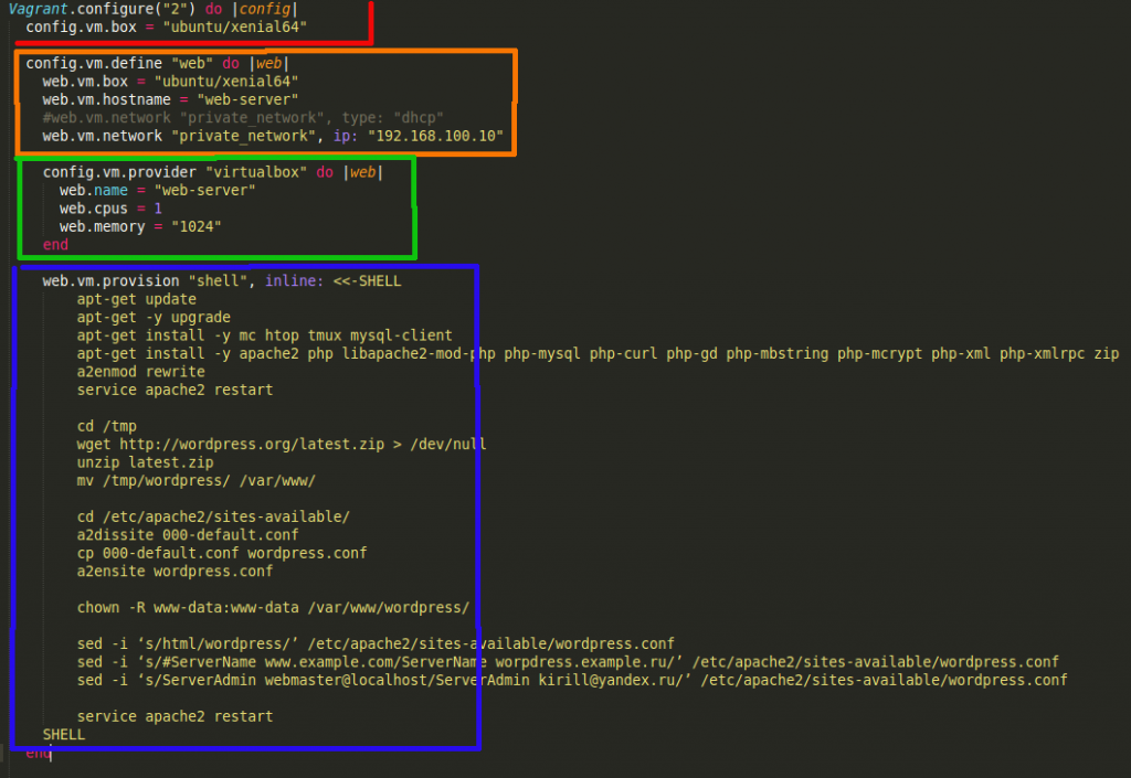 И наконец синим цветом выделена секция исполняемых при запуске гостевой ОС команд. С т.з. структуры Vagrant файла, она состоит из одной опции и относится к оранжевой секции, но с идеологической т.з. я решил выделить ее отдельно. Vagrant может сам,при создании и запуске VM выполнить ряд произвольных команд, тем самым автоматизируя Ваши действия по первичной конфигурации машины, снимая с Вас рутинные задачи. Все, что находится между ключевыми словами SHELL будет выполнено от имени root в командной строке гостевой ОС.