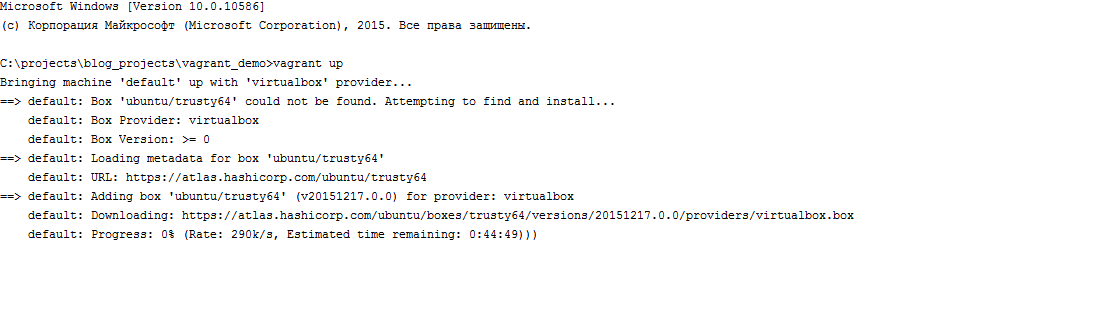 Теперь мы можем запустить команду , которая поможет вам создать и настроить виртуальную машину в соответствии с файлом vagrantfile.