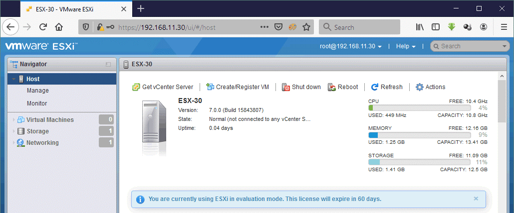Теперь будем использовать VMware Host Client для управления ESXi-хостом. Если выберем пункт «Host» в навигации, сможем просмотреть всю информацию о нем (версия, имя, CPU, память и состояние хранилища):