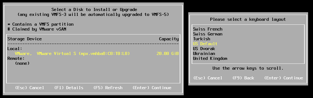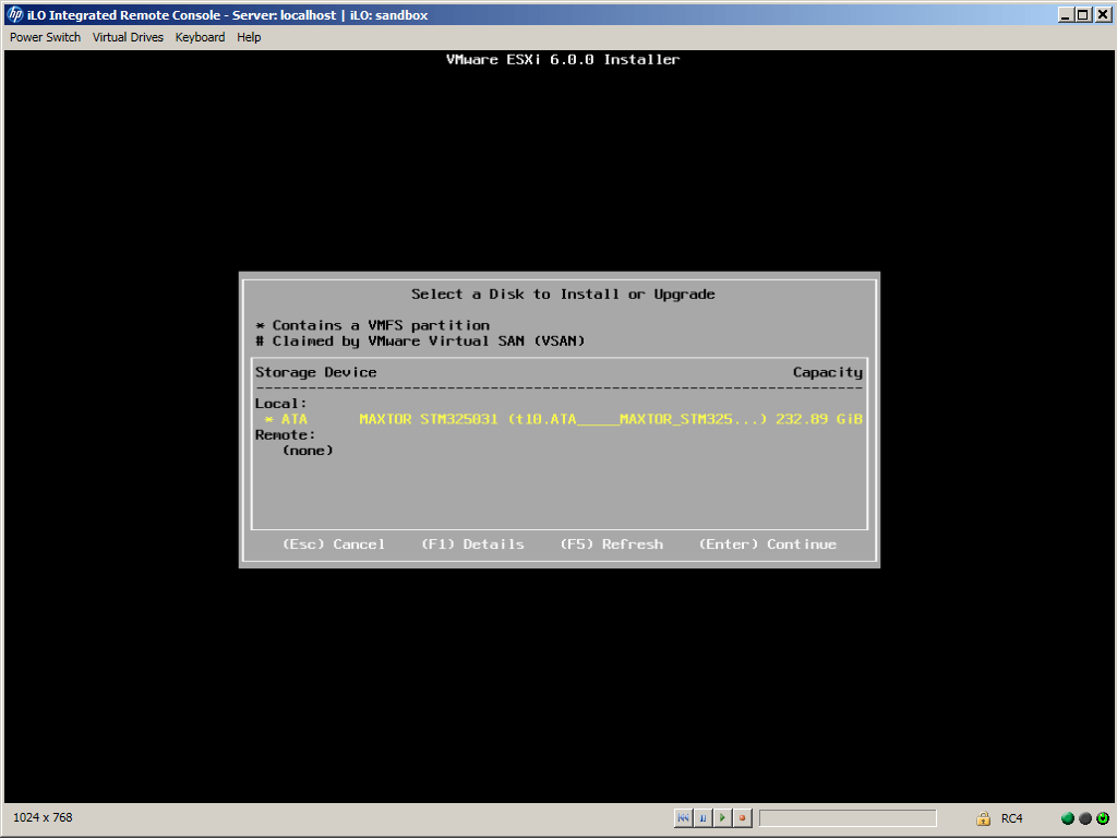 Бывает, что установщик ESXi не находит дисков для установки. Возможен вариант, когда не видны диски, находящиеся не в рейде, тогда нужно собрать RAID, даже если диск в сервере один из него можно собрать RAID-0. А бывает наоборот, видны только диски, находящиеся не в рейде. Тогда есть вариант установить на один из дисков или для надежности на оба ESXi, а потом собрать RAID-1. Несколько раз на серверах Intelданный способ спасал.