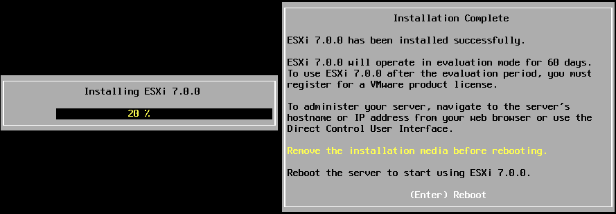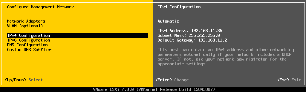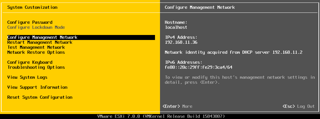 Гипервизор VMware vSphere установлен. Если ваш сервер хотя бы одним сетевым интерфейсом подключен к сети с DHCP сервером, он автоматически получит IP адрес, который вы увидите в консоли гипервизора (называется она DCUI). Этот IP адрес используется для управления гипервизором из web- интерфейса.