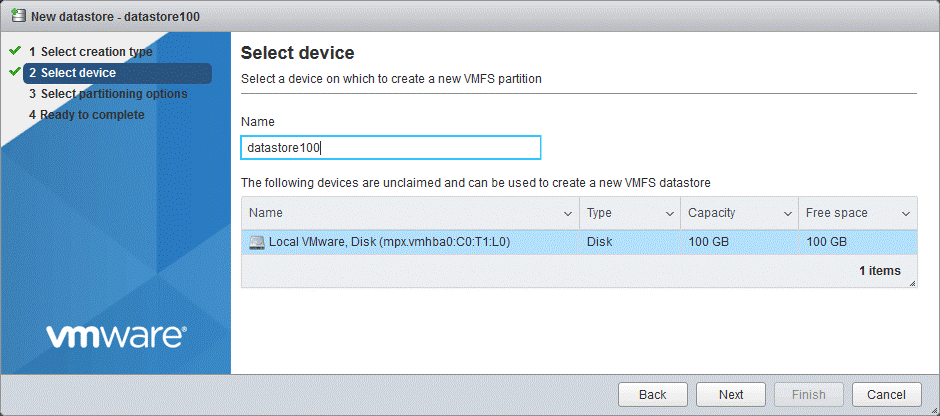 - Выбираем устройство. Это будет подключенный заранее физический носитель (у нас – диск объемом 100 ГБ). Вводим имя хранилища: