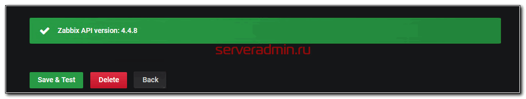 URL должен заканчиваться на скрипт api_jsonrpc.php. То есть полный url до web интерфейса и скрипт на конце. И не забудьте выбрать версию сервера. Там по умолчанию стоит 3-я. Я сначала не заметил этого. Некоторое время пришлось разбираться с тем, почему нет подключения к zabbix. После того, как все настроите, нажимайте Save & Test. Должны увидеть сообщение, что все в порядке.