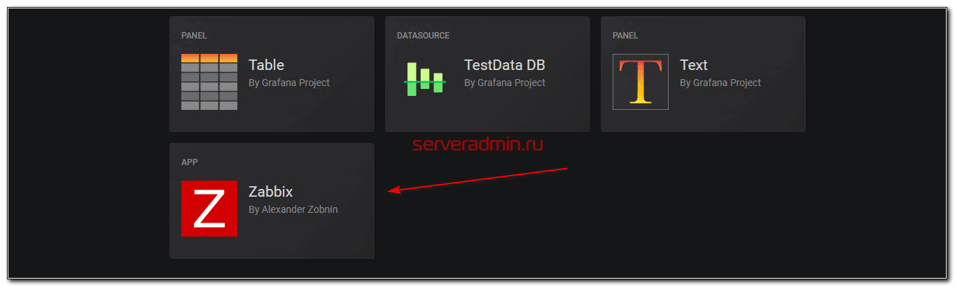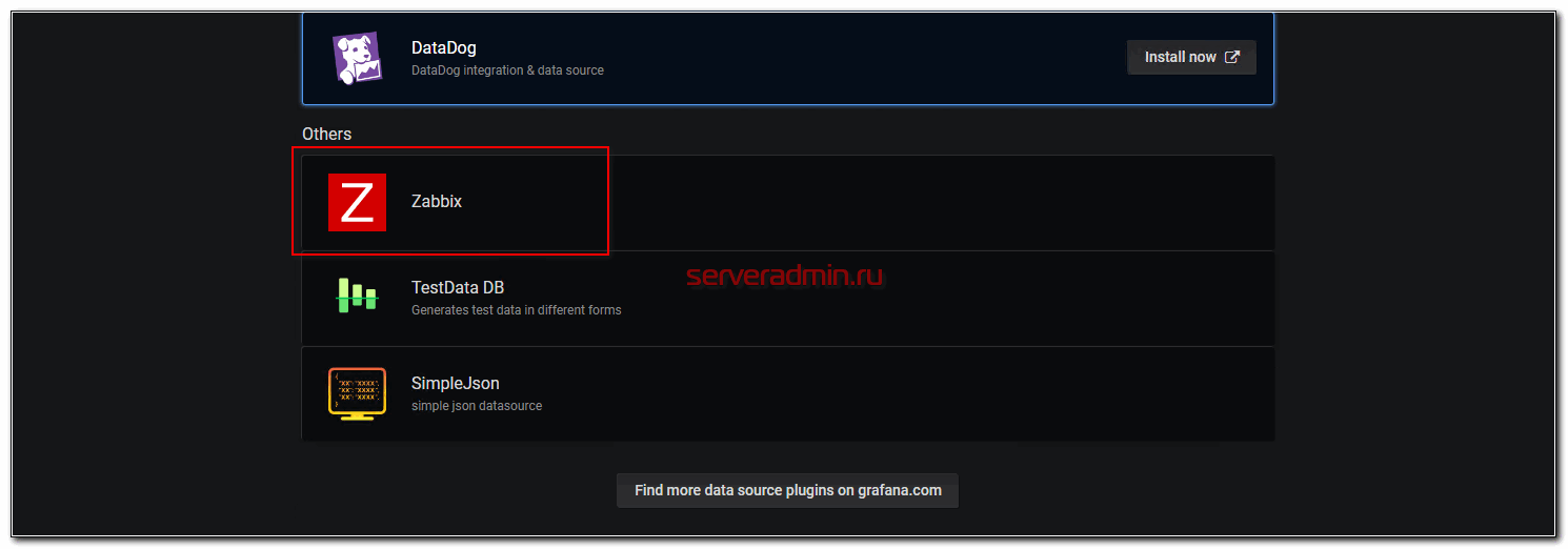 Теперь нам нужно по очереди подключить все Zabbix сервера, данные из которых мы хотим видеть в Grafana. Для этого идем в Configuration -> Plugins. Мотаем в самый низ и находим там Zabbix.