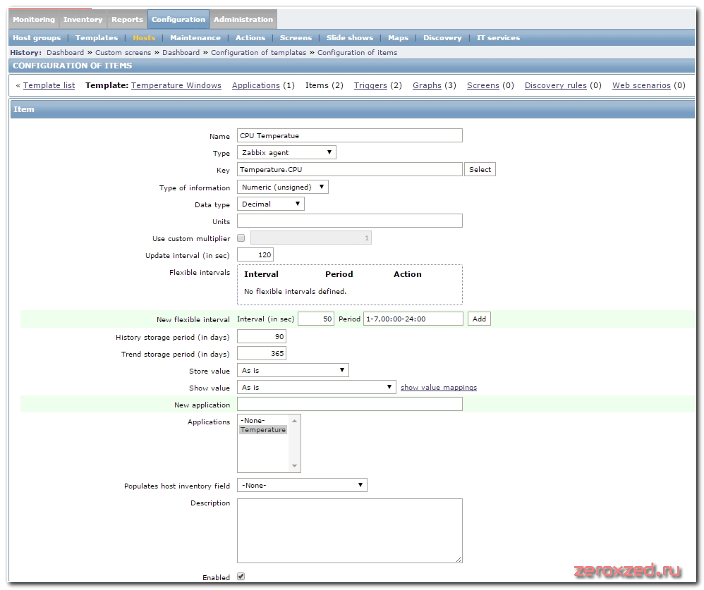Итак, сначала создадим шаблон. Идем в Configurations — Templates — Create Template. Шаблон я назвал Temperature Windows. Добавил в него Application — Temperature, затем Item CPU Temperatue. Заполняем поля итема как у меня на картинке: