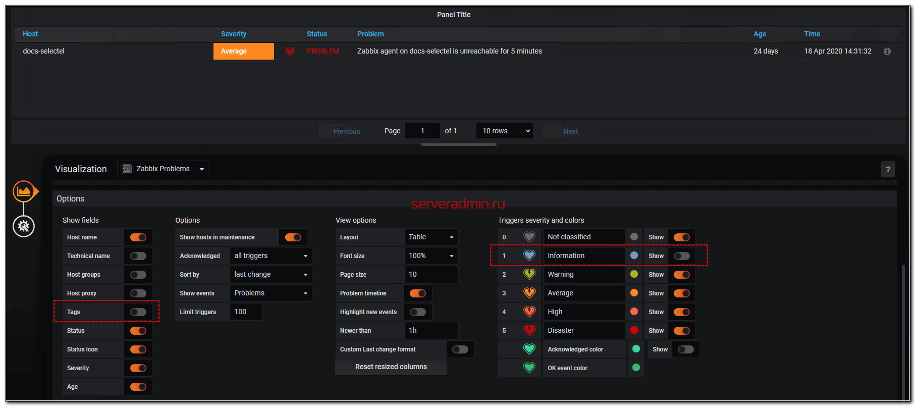 В общем случае достаточно указать только тип визуализации — Zabbix Problems и Data Source. Данные по активным триггерам по всем группам и хостам сразу же появятся. Ниже можно настроить некоторые параметры. К примеру, я не вывожу триггеры типа Information и тэги к ним, так как не использую их.
