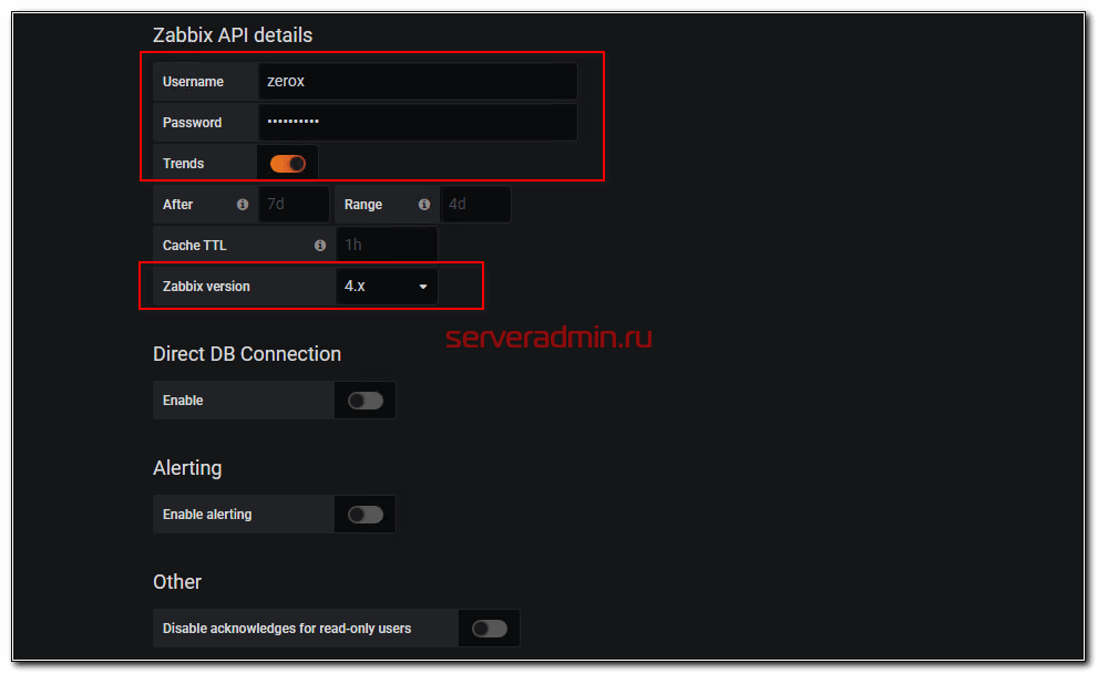 Здесь нам нужно заполнить параметры доступа к серверу Zabbix. Ко всем подключаемым серверам должен быть доступ со стороны Grafana. Так же нам нужен будет отдельный пользователь zabbix с доступом ко всем хостам, информацию с которых мы хотим видеть в Grafana.