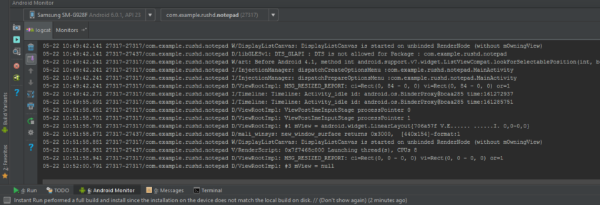 Пока ваше приложение работает, вы сможете получать отчеты в реальном времени через вкладку «logcat» в Android Monitor, расположенную в нижней половине экрана. Если что-то пойдет не так, что приведет к сбою или перерыву в работе вашего приложения, появится красный текст, который даст вам описание проблемы. Вы можете обнаружить, что все дело в том, что вы забыли разрешения или что-то еще, что легко исправить. По сути, это экономит массу времени по сравнению с слепыми попытками угадать, что пошло не так. Обязательно отфильтруйте типы сообщений, которые вы хотите видеть здесь.