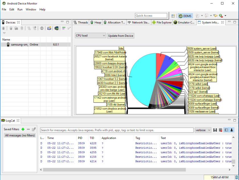 Вы также можете переключиться на вкладку мониторов и увидеть полезную информацию, такую как использование ЦП и т.д. Android Device Monitor продвигает этот мониторинг еще дальше и позволяет отслеживать все сразу, в комплекте с удобным пользовательским интерфейсом.