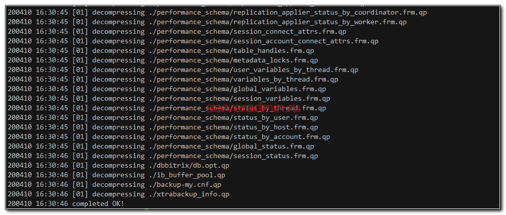 # xtrabackup --decompress --target-dir=/root/backupdb/full