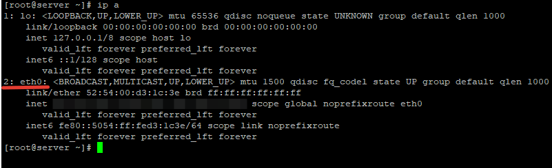 1: lo: <LOOPBACK,UP,LOWER_UP> mtu 65536 qdisc noqueue state UNKNOWN group default qlen 1000 link/loopback 00:00:00:00:00:00 brd 00:00:00:00:00:00 inet 127.0.0.1/8 scope host lo valid_lft forever preferred_lft forever 2: eth0: <BROADCAST,MULTICAST,UP,LOWER_UP> mtu 1500 qdisc pfifo_fast state UP group default qlen 1000 link/ether 52:54:00:d3:1c:3e brd ff:ff:ff:ff:ff:ff inet 185.*.*.*/16 brd 185.*.*.255 scope global eth0 valid_lft forever preferred_lft forever 3: eth1: <BROADCAST,MULTICAST> mtu 1500 qdisc noop state DOWN group default qlen 1000 link/ether 52:54:00:5f:f3:b8 brd ff:ff:ff:ff:ff:f