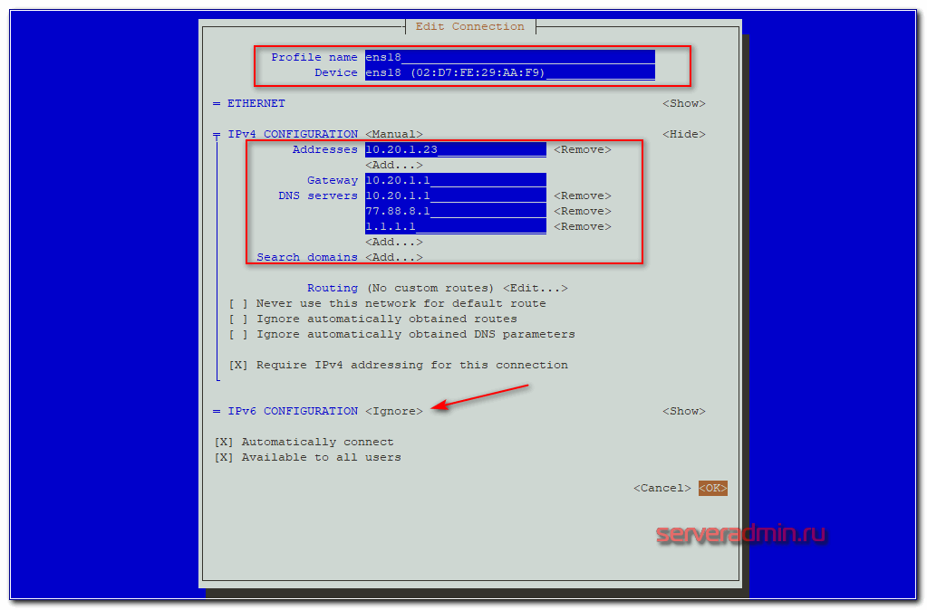 – заменяем шлюз на тот, который указан в сетевом интерфейсе eth0