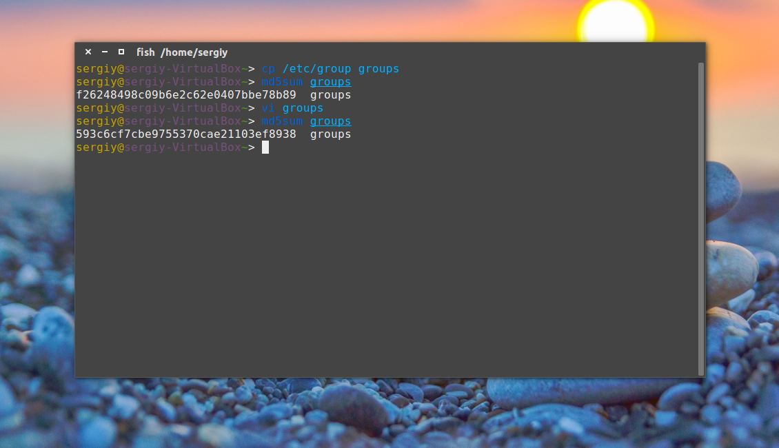 Как видите, теперь значение отличается, а это значит, что содержимое файла тоже изменилось. Дальше верните обратно первую строчку root:x:0: и скопируйте этот файл в groups_list и