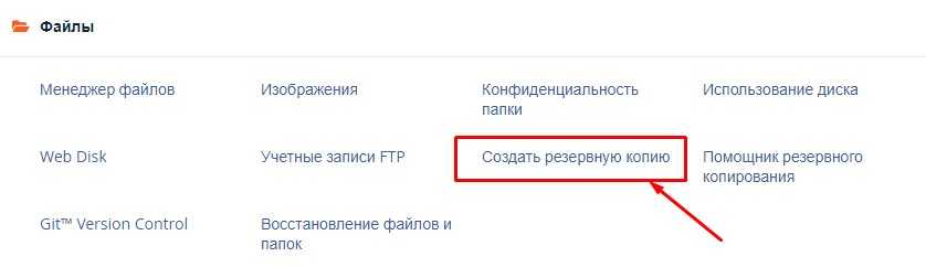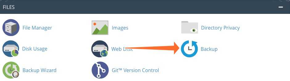 Чтобы восстановить базу данных, откройте интерфейс Backup (Создать резервную копию), который вы найдете в разделе Files (Файлы) на главной странице cPanel.