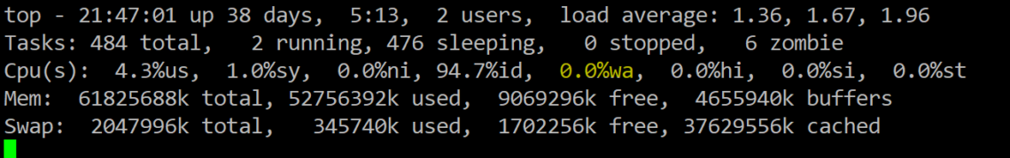 In the screenshot above I have highlighted the I/O wait value. This is a percentage of time that the CPU was waiting on input or output commands to complete. This is usually indicative of high disk activity. While a high wait percentage alone may not significantly degrade CPU-bound tasks, it will reduce I/O performance for other tasks and will make the system feel sluggish.