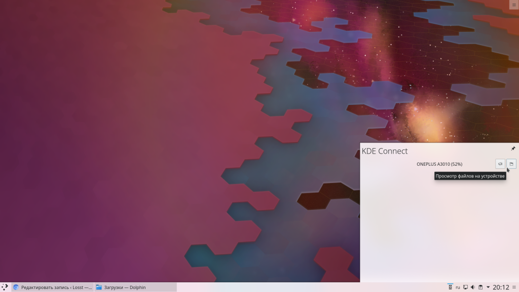А на компьютере, на панели задач, появится индикатор KDE Connect, с помощью которого можно обращаться к телефону, смотреть состояние его батареи и содержимое общих папок: