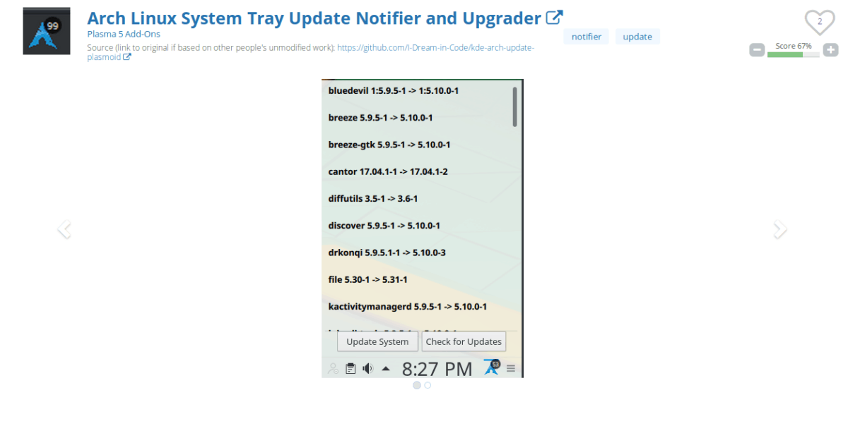 В Виджет уведомления об обновлениях Arch Linux не похож на другие в этом списке, и вы не сможете скачать файл Plasmoid и загрузить его. Вместо этого у разработчика есть доступный пакет AUR. Чтобы установить его, следуйте пошаговой инструкции.