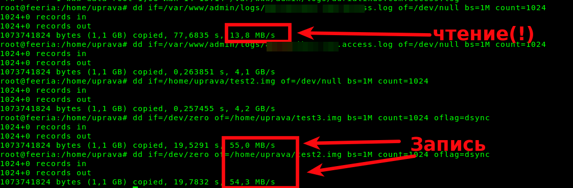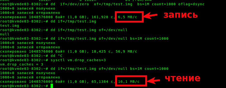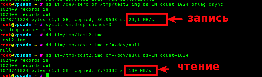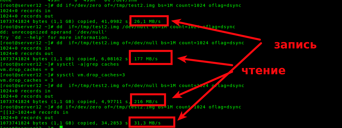 При записи на диске, мы просто выполняем чтение из устройства /dev/zero, которое является источником бесконечного числа байтов. Когда происходит чтении с диска, мы читаем записанный ранее файл и отправляем его в устройство /dev/null, которого на самом деле нет. В течение всего процесса команда dd отслеживает скорость, с которой происходит передача, и сообщает о ней.