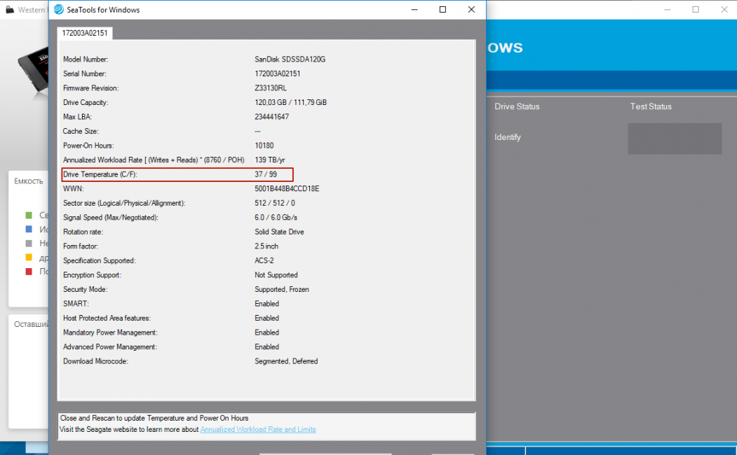 В окне информации о накопителе подробно описаны его параметры: модель, устройство, поддерживаемые режимы работы и т.д. Эти сведения могут пригодиться для детальной диагностики или обращения в сервисный центр.