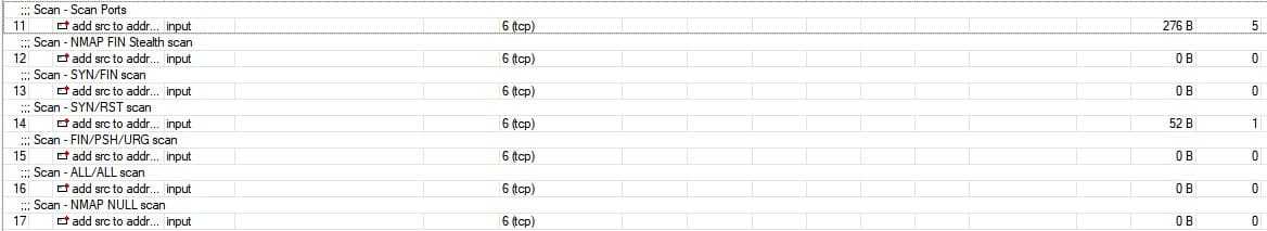 /ip firewall filter add action=drop chain=input comment="Drop - port scanners" src-address-list=\ Port-Scanners add action=drop chain=forward comment="Drop - port scanners" \ src-address-list=Port-Scanners add action=add-src-to-address-list address-list=Port-Scanners \ address-list-timeout=2w chain=input comment="Scan - Scan Ports" protocol=\ tcp psd=21,3s,3,1 add action=add-src-to-address-list address-list=Port-Scanners \ address-list-timeout=2w chain=input comment=\ "Scan - NMAP FIN Stealth scan" protocol=tcp tcp-flags=\ fin,!syn,!rst,!psh,!ack,!urg add action=add-src-to-address-list address-list=Port-Scanners \ address-list-timeout=2w chain=input comment="Scan - SYN/FIN scan" \ protocol=tcp tcp-flags=fin,syn add action=add-src-to-address-list address-list=Port-Scanners \ address-list-timeout=2w chain=input comment="Scan - SYN/RST scan" \ protocol=tcp tcp-flags=syn,rst add action=add-src-to-address-list address-list=Port-Scanners \ address-list-timeout=2w chain=input comment="Scan - FIN/PSH/URG scan" \ protocol=tcp tcp-flags=fin,psh,urg,!syn,!rst,!ack add action=add-src-to-address-list address-list=Port-Scanners \ address-list-timeout=2w chain=input comment="Scan - ALL/ALL scan" \ protocol=tcp tcp-flags=fin,syn,rst,psh,ack,urg add action=add-src-to-address-list address-list=Port-Scanners \ address-list-timeout=2w chain=input comment="Scan - NMAP NULL scan" \ protocol=tcp tcp-flags=!fin,!syn,!rst,!psh,!ack,!urg