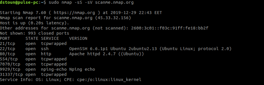 Как видно из скриншотов показанных выше Nmap определяет не только номер и состояние порта, но и службу которая на этом порту запущенна. Конечно, в большинстве случаев это достоверная информация, но есть хитрые системные администраторы, запускающие службы на нестандартных портах. К счастью Nmap даёт возможность определить действительно ли именно такая служба работает на найденном порту, а также получить дополнительную информацию, такую как имя хоста, имя приложения, номер версии, тип устройства и семейство ОС.